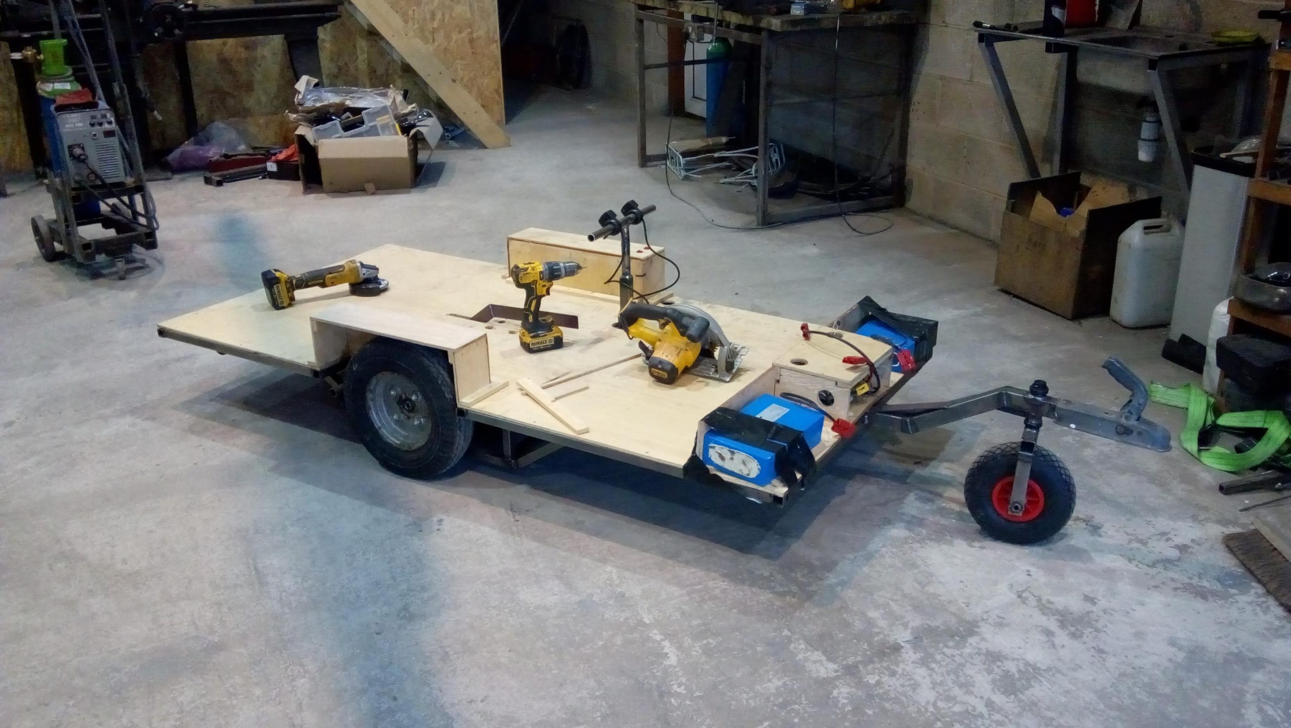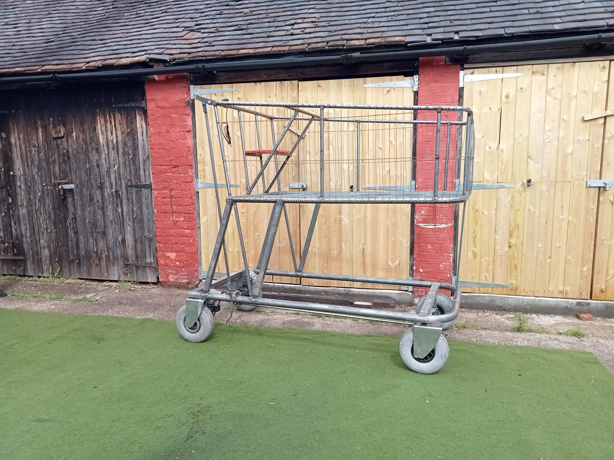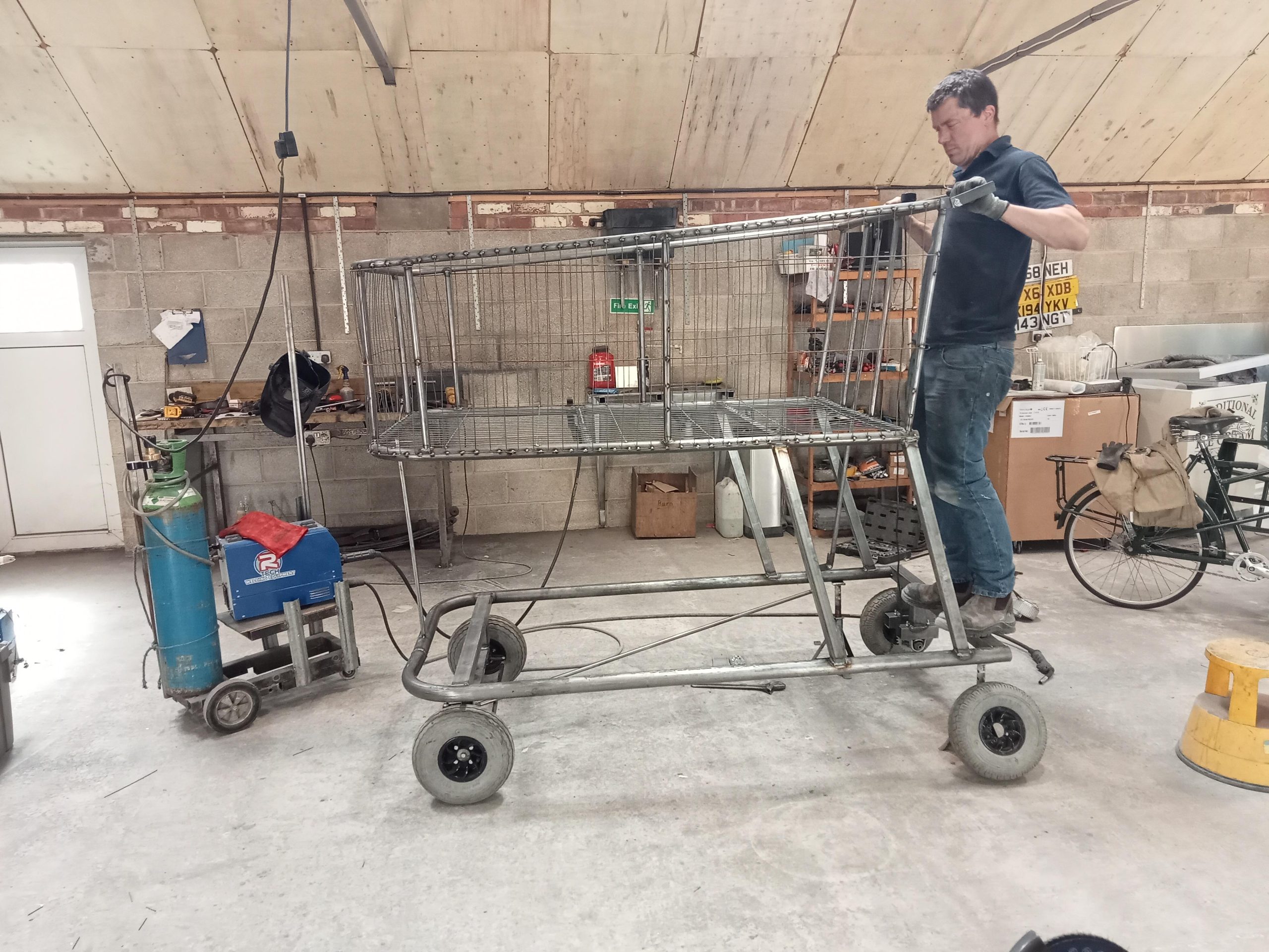 Large electric powered shopping trolley: A famous Youtuber asked us to build the largest shopping cart that could fit through their local shopping mall. It was fitted with two 250w motors, brakes and steering. It even had a reverse gear !