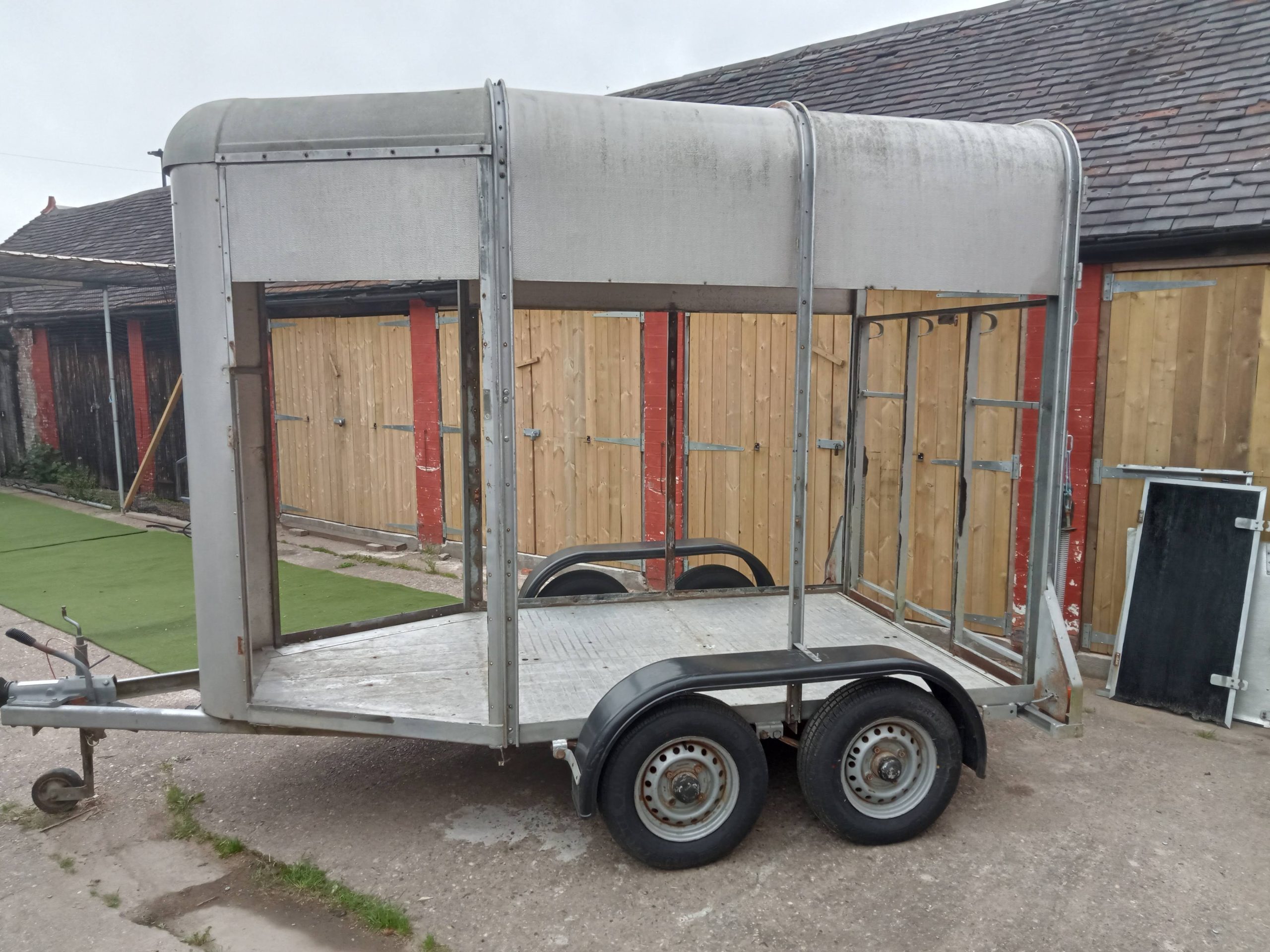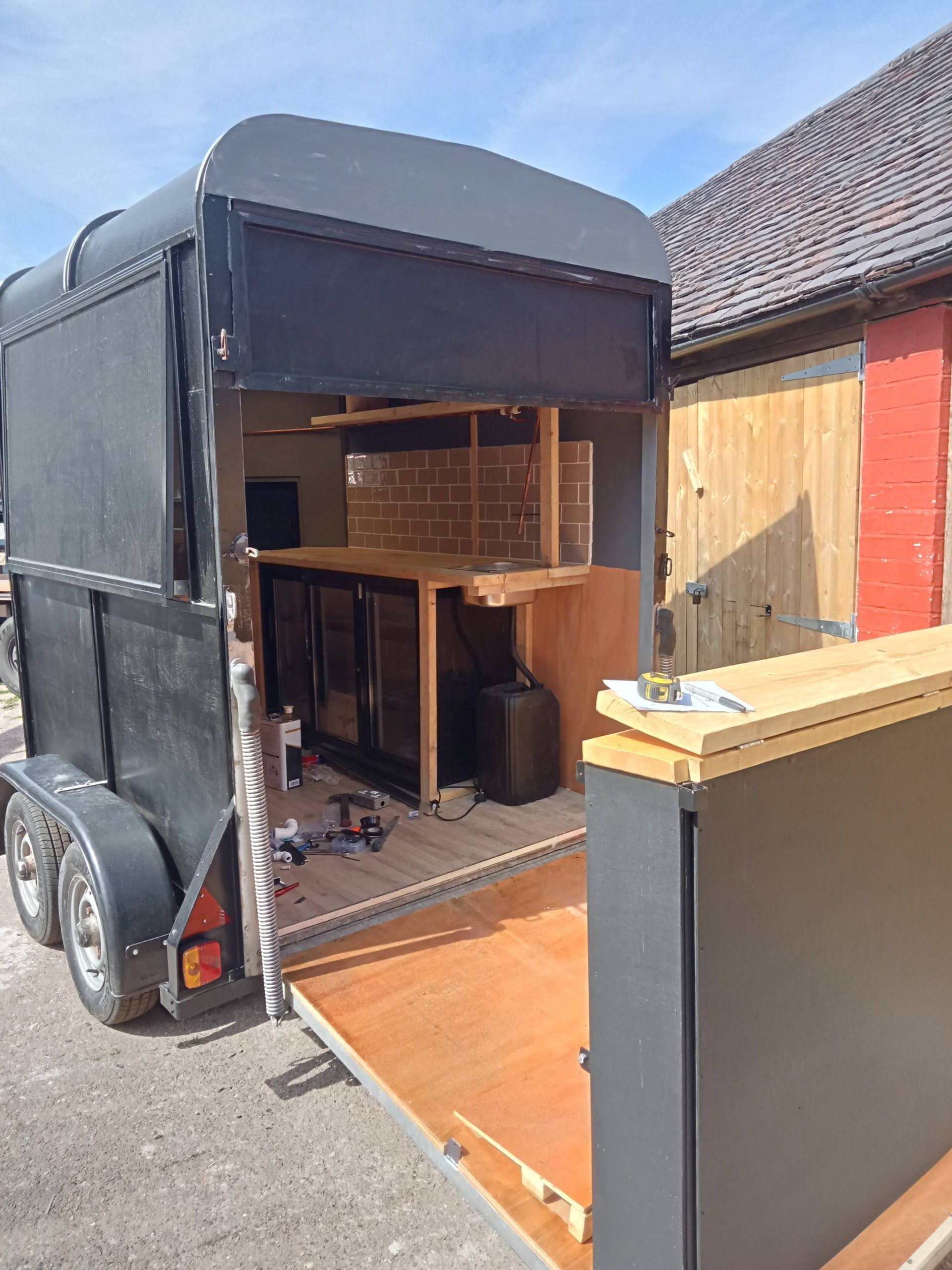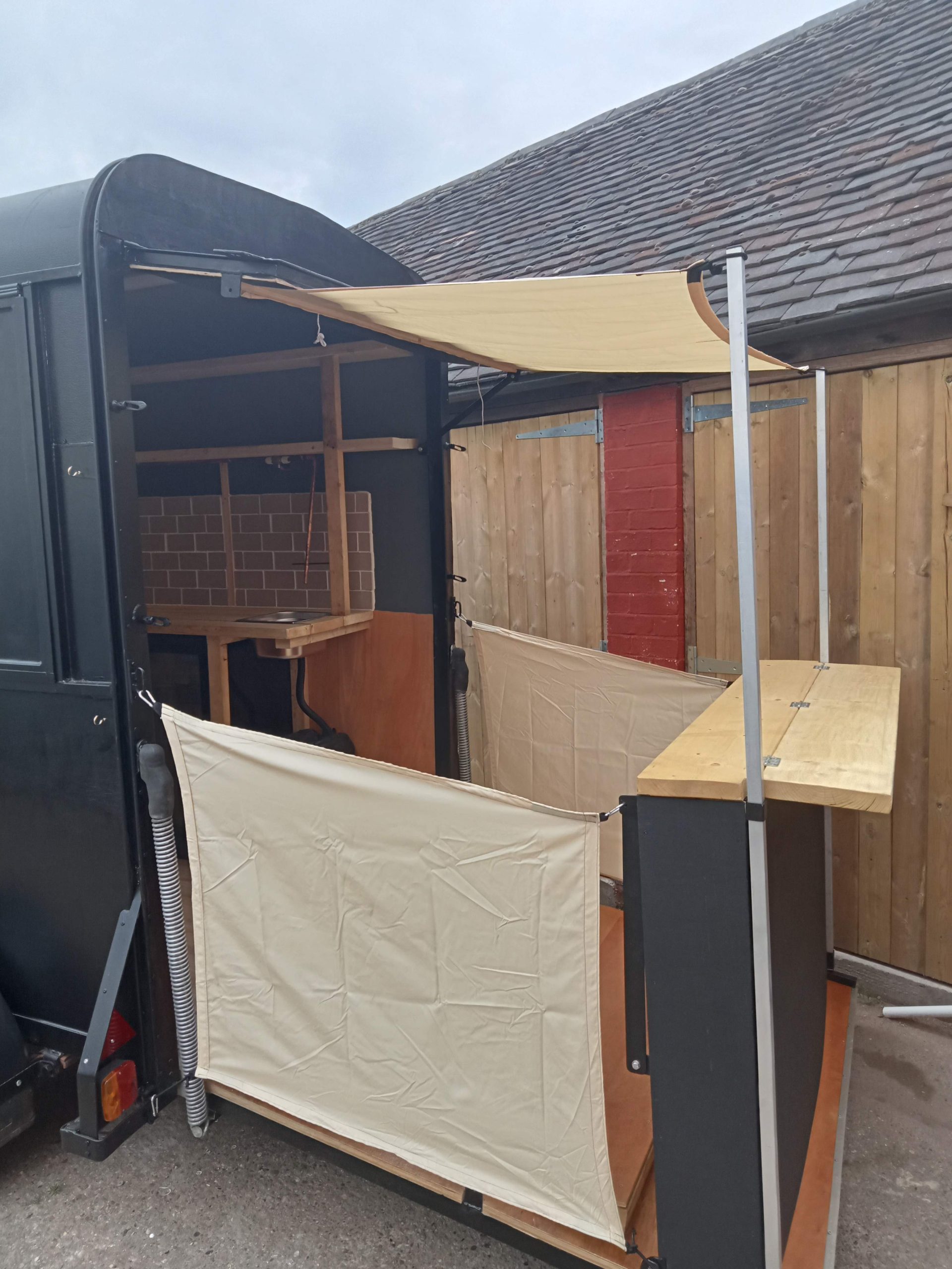 Horse trailer mobile bar: A drinks company asked us to build a mobile bar with two serving bars and rain canopy.